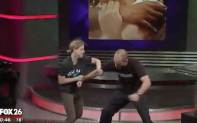 Fox 26’s Isiah Carey with Trea Drake and Meredith Neel of Krav Maga Houston providing techniques to escape an abduction attempt.